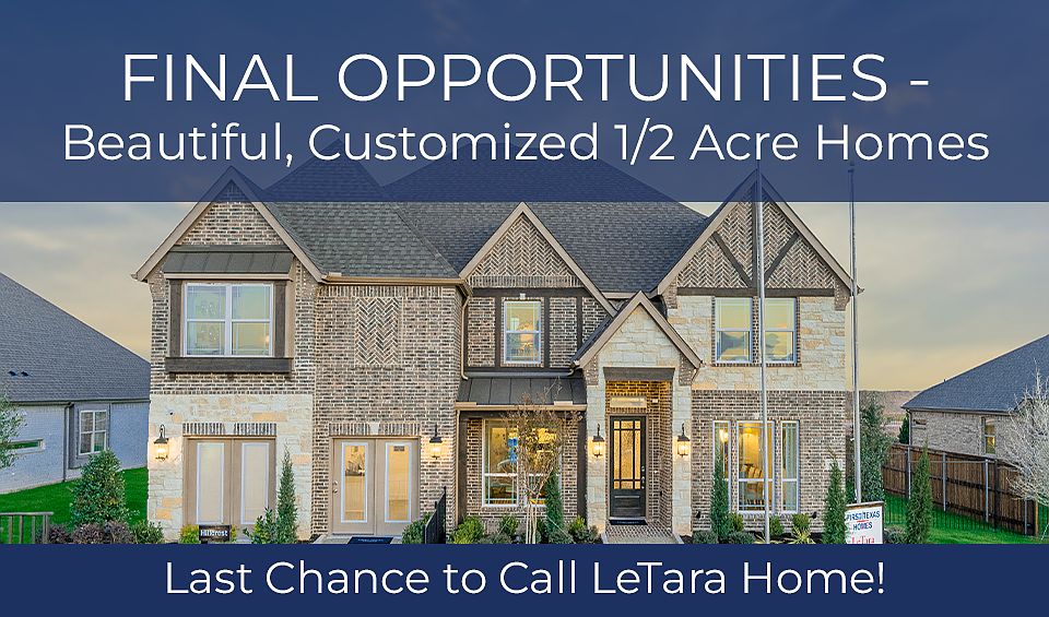 Final Opportunities - Beautiful, Customized 1/2 Acre Homes in Haslet, TX! Act fast don't miss the chance to call LeTara in Haslet, TX, home! Nestled within the award-winning Northwest Independent School District (Northwest ISD), LeTara is thoughtfully designed with premier resort style amenities. With a community pool, walking trails with fitness stations, and thoughtfully placed parks, this neighborhood blends peaceful living with modern convenience. Located just minutes from Alliance Town Center and Presidio Junction, you'll have easy access to top-rated dining, shopping, and entertainment. Plus, with quick connections to Highways 114, 287, and I-35, commuting to Fort Worth and surrounding areas is a breeze. LeTara is perfectly positioned on the south side of Avondale Haslet Road near FM 156, in an area experiencing rapid growth and increasing value, as major companies move their headquarters nearby. This is your LAST opportunity to own a brand-new home in one of DFW's fastest-growing suburbs-a place where value, location, and lifestyle come together. Visit this community, and contact a sales consultant today!