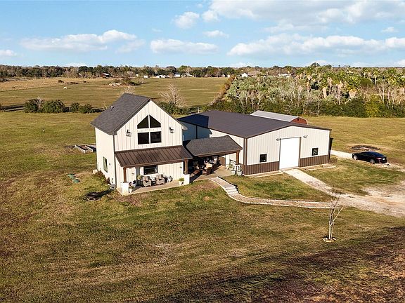 Rare opportunity to own 17+ unrestricted acres in Manvel with stunning views, a private pond, & endless potential. The property features a custom farmhouse-style residence built in 2022, originally designed as a pool house, offering soaring two-story ceilings, an open-concept living area, walls of windows, & a spacious kitchen with granite countertops, oversized island, gas range, pantry, and soft-close cabinetry. The loft-style bedroom includes vaulted ceilings, a balcony overlooking the main living space, and peaceful countryside views. House plans for a future main residence are already completed and on file, with a designated house pad in place—allowing the next owner to move forward quickly with building their dream home. Additional improvements include a barn, workshop, tiny house for guest space or storage, covered patio, well and septic, and ample room for RVs, boats, or livestock. No restrictions. A truly unique estate opportunity combining immediate use with long-term vision.