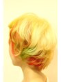 ブリーチでとことん明るくしてから、ライムグリーンとレッドのマニキュアを重ねて色とりどりのビビッドなカラーで仕上げました