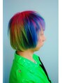 もうおなじみの原宿界の神!じゅんにゃんです。今回は刈り上げを後ろまで増やして、ブリーチリタッチと毛先も軽くブリーチして根元をピンク20%、毛先をブルー50%、イエロー(MANICPANIC)で染めました。個性的な注文でまた新しいデザインができました。