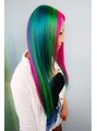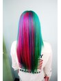 全体をブリーチした後で、ホットホットピンク(20%)アフターミッドナイト(20%)グリーンの三色を太めのメッシュでミックスさせました。綺麗なグラデーションっぽくなりました。
