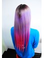 まなかちゃんです。根元はカラーのアッシュバイオレッド、全体はブリーチをして中間はウルトラバイオレット、(50%)毛先はピンク(10%)で染めました。すごく綺麗なグラデーションになりました。