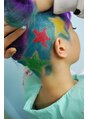 全体はショッキングパープル20%。左毛先5cmにグリーン右毛先10cmにピンク20%にしました。刈り上げは星をちりばめました。そして、トップのモヒカン刈り上げ部分は伸びてきて普通のレイヤーみたいになりました。ショートボブベースにしました。