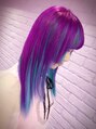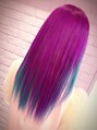 リッスンフレーバーの店員の、背骨ちゃん来てくれました。ブリーチしてトップはショッキングパープル、全体はエンチャンティッドフォレストの10%で染めました。多少、色移りして青っぽくなりましたがいいかんじの色になりました。