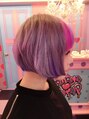 のんちゃん、来てくれました!前下がりボブにして刈り上げて、ブリーチ2回リタッチをして、インナーをピンク、パープルのツートンにして、トップは黄色味を消すためにシルバーパープルを薄めにいれました。エクステでポイントでティンセルもいれました。