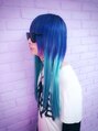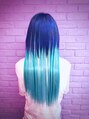 メトくんです。地毛はブリーチ二回して、前髪をアシメにして毛量調整してショッキングブルーの20%をいれて、エクステを水色二色いれて、60本つけました。ボリュームも満点ですごくいいかんじになりました。