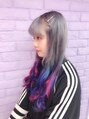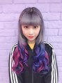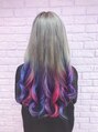 全体をブリーチして、ベースはシルバーをいれて、毛先はピンク、パープル、ブルーの三色にしました。退色してパステルになるのも楽しみですね。