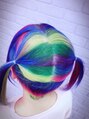 ブリーチリタッチして、ブルー、パープル、ピンク、イエロー、グリーン の五色の派手派手なレインボーにしました。刈り上げの伸びかけたところが可愛いですね!
