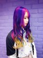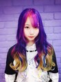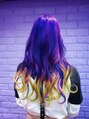 花冷え、moon walkちゃんです。ブリーチを全体にして、インナーをピンク、水色!トップを色味を変えたパープル二種類交互に毛先をイエローにして、最後にインナー二本白のエクステ、ティンセルをつけました。