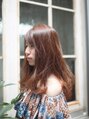 Aラインの切りっぱなしのミディです。毛先にはくせ毛風ゆるふわパーマでスタイリングも楽チン☆空間をあけるように毛量調節することで毛先にかけたパーマが綺麗に仕上がります。厚めバングで可愛くフェミニンな印象に☆