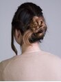 全体を緩めに巻き、オーバーサイドを分けます。トップは、ひとつに結び「くるりんぱ」します。両サイドは表編み込みをして、毛先は三つ編みをし、ラフに緩ませて毛先を留めます。下の位置で留めるとシニオン風になりますよ!