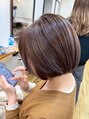 顔まわりは重めフルバングで可愛らしさを、全体はやわらかいブラウンのワンカラーに。耳後ろ~襟足にかけてミルクティーベージュのインナーカラーを入れ、巻いた時にちらっと見えるコントラストで抜け感をプラス。