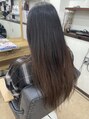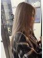 黒染めの履歴が2回ほどある為、全体を弱い薬剤でブリーチし、抜けの悪い部分のみ強い薬剤を使っています。全体に2回ブリーチしていますが、根元は1回のブリーチてす。トリートメントしながらブリーチやカラーをしています。