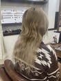 なるだけダメージを与えないように一度目のブリーチで抜けにくい部分を見つけ、二度目の追いブリーチでムラのないように施術しています。カットはロングのウルフカットです。髪質改善の処理剤なども使っています。