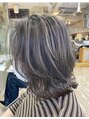 肩ラインの前上がりベースでトップにレイヤーを重ね、動きのあるスタイルに。白髪ぼかしのハイライトにベージュカラーをオン。透明感溢れる上品な仕上がりです。
