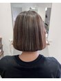 ハイライト部分はブリーチを使って一度明るくし、全体にアッシュグレージュで透明感のある雰囲気にしてます。白髪ボカシや立体感が欲しい方にオススメです。