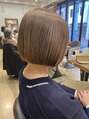 切りっぱなし・ワンレングスボブ骨格や髪質に合わせ、小顔に首が長く見える様な、ボブスタイル。前髪をセンターパートで、おでこが見えることで肌が縦長に見え、顔がシャープに見えます。似合わせ・ボブになります。白髪ぼかしの明るめカラーです。