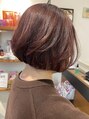 切りっぱなし・レイヤーボブ骨格や髪質に合わせ、小顔に首が長く見える様な、ボブスタイル。前髪をセンターパートで、おでこが見えることで肌が縦長に見え、顔がシャープに見えます。カラーは白髪ぼかしの暖色系の色味にハイライトを入れたスタイルになります