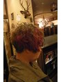 約一年間ホームケア商品を使用していただき、髪の状態がかなり回復しやっとパーマをかけられる状態になったので、かけました♪リッジも綺麗に出ました。フロントはピンク、バックはグリーンのマニキュアをしています。パーマは細かめのロットでランダムに♪