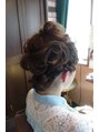 お祭りの山車に出るためのセットです。フロントから右サイドは編み込みを入れて、モヒカン風にしました。ふわふわで可愛い感じになりました。