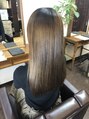 全体をブリーチされているのでダメージをなるべ最小限に抑えアイロンは使用せずにブローのみで矯正してます。ブローだとアイロンとちがって熱でのダメージが少ないのでおすすめです。ブローする事によって自然且つ艶々に仕上がります。【キャラ/縮毛矯正】