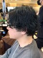 メンズのセンターパートにスパイラルパーマをかけたスタイルです!パーマを強めにかけてカール感をしっかりと出しました!カラーはブルーブラックで、暗めだけど透明感のある重たすぎないブラックで印象を変えます◎スタイリング剤はグリースで束感セット♪