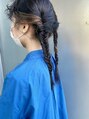 耳周りに襟足にはベージュのハイライト、地毛のブラックを残して根元からランダムにブルーバイオレットを。ブリーチ必須です。編んでもアクセントになるように。前髪はくせ毛のようにパーマを。根元から立ち上げくしゃくしゃに。
