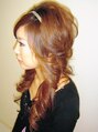ベースは前髪長めのミディアムレイヤー。エクステを耳下からバック中心にサイドと合計30本つけてボリュームUP!!カラーは9トーンのブラウンをベースに表面にオレンジのハイライトを入れて立体感を。仕上げはアイロンでリバース巻きに。