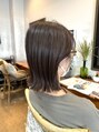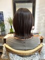 ぷつっと切りっぱなしのボブスタイルを外ハネにスタイリングしました。オーガニックカラーのグレージュ系で赤みを抑えてやわらかいお色にお染めしております。