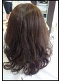 カットは毛量を調整して指通りを良くし、長さを変えないように毛先の傷みをカットしました。ヘアカラーは低アルカリカラー。程よい明るさ(グりーン味のブラウン)にしています。仕上げの方は、元々掛かっているデジタルパーマをいかして仕上げています。