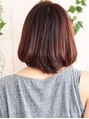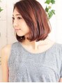 肩くらいに伸びるとどうしても跳ねてしまいがちのロブ。 毛先にワンカールを入れてそれを解消。 前髪は立ち上げて流す事で女性の色気を演出できます。 カラーは日差しの強い時期にも綺麗に見せるナチュラルカッパーです。ツヤ感を演出しました