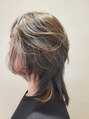 セミディウルフ。サイドは短く、バックは長くしたくびれをつけたウルフスタイル。イノアカラーとハイライト、イヤリング、インナーカラーの組み合わせ。メタルDX で前処理、ケラスターゼカクテルトリートメントでアフターケア。