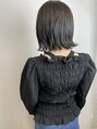 黒髪からのオリーブカラー。くすみ感もある柔らかい質感です。カットは伸ばしかけの前上がりボブにカットしています。