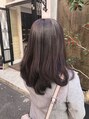 【お客様スタイルです】レイヤースタイルです。前に持ってきたときに軽く見えるように顔まわりを前上がりに切り内巻きに収まりやすいようになっています。カラーは7レベルのパープルベージュで重すぎずけどツヤ感が出るように染めています