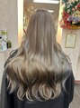 ケアブリーチを使ったハイライトを入れさせていただきました。お客様のご希望のスタイルに合わせて太さや量を調整させていただきます。オンカラーはミルボン オルディーブのフォギーグレージュで染めました。