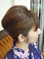 きっちり上げた浴衣アップです。最近はルーズなスタイルが多いですので、逆にキレイなツヤを出したスタイルが目を惹きます。ボブのスタイルで襟足が短くトップが長い方にもお勧めです
