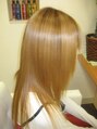 縮毛矯正+カールとカラーのスタイル。ここまで発色しているカラーでもツヤ感のあるストレートカールに仕上がります。すっきりまとめたい方はストレートで止めて、毛先に動きが欲しい方には+カールがお勧めです