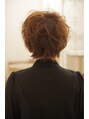 トップは女らしい曲線的な丸みを出しつつ、顔まわりをタイトに締めることで、意志のある表情に。ショートでも幼く見えない前下がりラインがポイント。少し赤みのあるプライムオレンジでカラー。