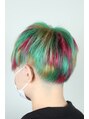 グリーンベースに赤とオレンジをアクセントにしたショートヘアのメッシュスタイル。ベースとアクセントが反対色なので目立ち度高めです!