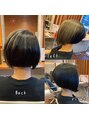 大人カッコいい前下がりのショートボブはシャープに切ったライン、襟足をしめてスッキリ見せたりと、メリハリを効かせて絶妙なバランスに!ハイトーンカラーはシークレットハイライトで束感、質感をプラスしてくすみカラーのアッシュベージュを!