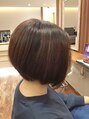 透明感抜群のグレージュカラーと前下りグラボブで、洗練された大人の女性を演出。Aujuaトリートメントで髪の内部から潤いを与え、指通りの良い艶髪に。30代40代の気になる白髪も自然にカバーし、若々しい印象を与えます。