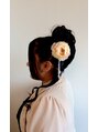 ただのハーフアップじゃつまらないのでねじり留めの中に細い編み込みを入れて遊び心を。高く盛ったトップで華やかさも。淡いピンクベージュの花飾りがいいアクセントになっています^ ^