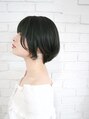 暗めのモスグリーンベースで、表面と毛先に細めのハイライトを入れてます!透明感のあるグリーンカラーが目を引きます。ゆるやかな雰囲気の重ためショートボブで柔らかさを出しています。