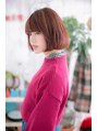 斜めバングと内巻きワンカールのノームコアなナチュラルボブ。清楚でフェミニンな雰囲気のスタイルにパンチの効いたレッド系カラーをオンすることで、個性的でスポンテニアスな甘辛ミックスボブにイメチェン。フリンジバングと合わせて旬顔に。耳かけも◎