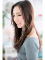 暗髪センターパートでエキゾチックな印象のエアリーロング。胸元で揺らめく、毛先のくせ毛風ワンカールでやわらかな雰囲気に。フェイスラインを包み込むサイドの毛流れで小顔にメイクします。ラフなアップのヘアアレンジもこなれ感が出て大人かわいい。