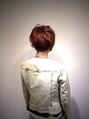 襟足は短くハサミで刈り上げ、前には重さを出し前下がりのシルエットにしました。前髪の左側にポイントでビビッドなレッドが入っています。全体はオレンジベージュで仕上げました。