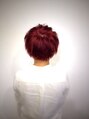 ブリーチをして、鮮やかなガーネットレッドを入れ、深めに入れて落ち着きすぎず、派手すぎずに遊びました。ナチュラルなショートカットに前髪をジグザグに切り、遊び心を加えました。