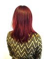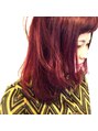 一度ブリーチをしてから深いワインレッドをのせました。ブリーチをする事により赤の深みが増します。(状態や色味によってはブリーチ無しでも出来ます)カットは顔まわりを顎下で切り、レイヤーを入れることによりお顔を小さく見せられます。