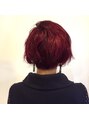 ブリーチをしてから ドイツ発のヘアマニキュアでワインレッドにしました。とてもビビッドな発色です。カットはレイヤーをいれつつ がっつりと前下がりに仕上げました。襟足を少し残してあるので大人っぽい雰囲気になっています。