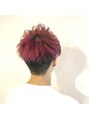 ブリーチを1回してカラーミューズ のピンクにしました。ビビッド過ぎず、淡いピンク色です。カットはサイドを刈り上げ、やや前下がりに切ってあります。